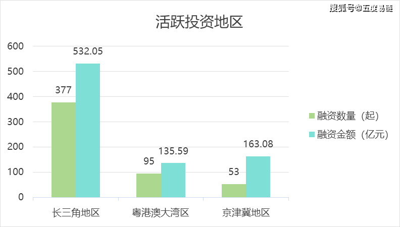 心集聚、多点支撑”的格局,长三角、粤港澳大湾区、京津冀三大区域成为资本布局的核心阵地,合计融资事件占比超80%,形成各有侧重、协同互补的差异化发展生态。其中,长三角地区以377起融资事件、532.05亿元融资金额稳居首位,凭借全产业链优势成为行业融资的“主战场”;粤港澳大湾区以95起事件、135.59亿元额度紧随其后,京津冀地区则以53起事件、163.08亿元额度展现出高额度均值的特点。